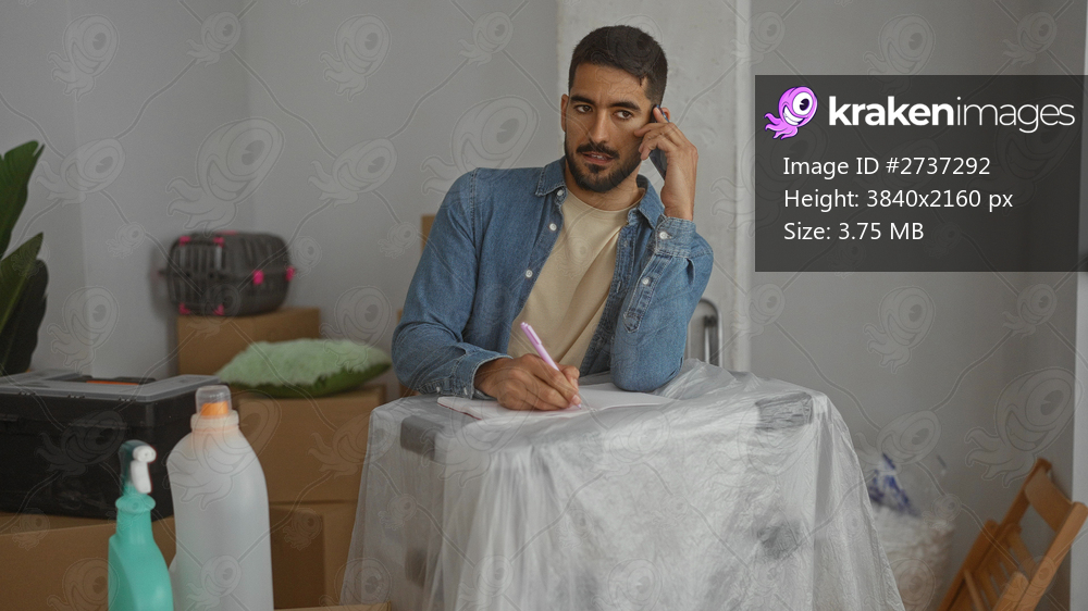 Young man writing and talking on phone in new home surrounded by boxes and cleaning supplies in living room of modern apartment