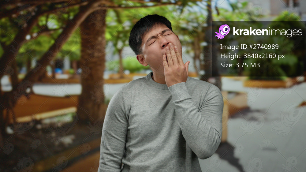Young man yawning energetically in a sunny park surrounded by lush trees, emphasizing the tranquility of the outdoor setting.