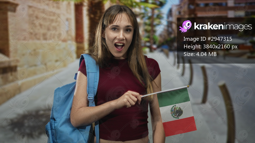 Young mexican student woman holding small mexico flag on sunny city street with blue backpack and cropped burgundy top; pride celebration.