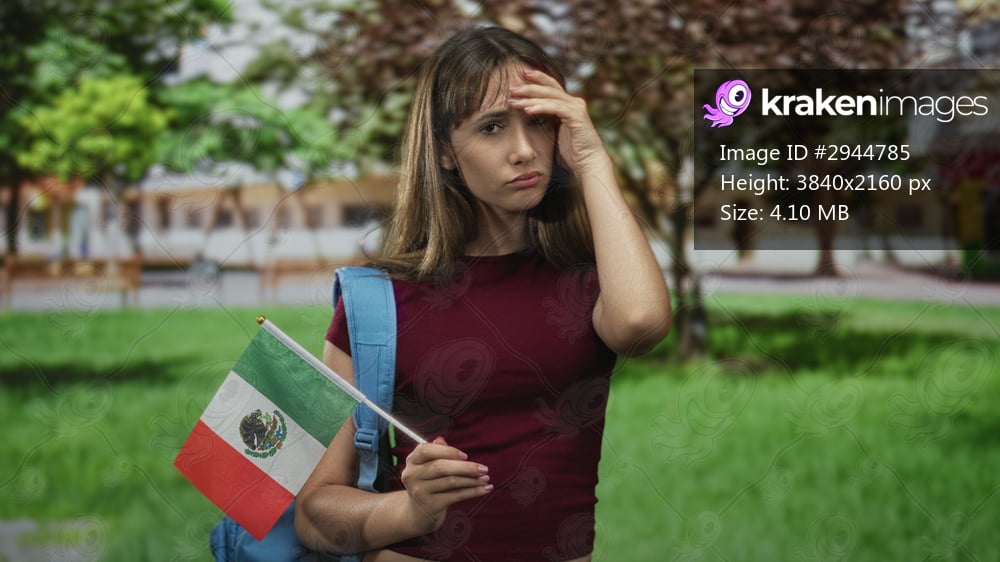 Young mexican woman holding mexican flag, hand on forehead inside building; frustration identity youth.