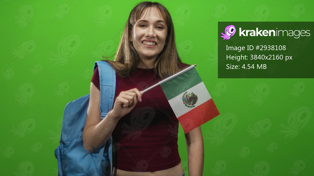 Young mexican woman holds a mexican flag and wears a blue backpack in studio against a green backdrop while smiling and waving the flag; national pride. - Kraken Images