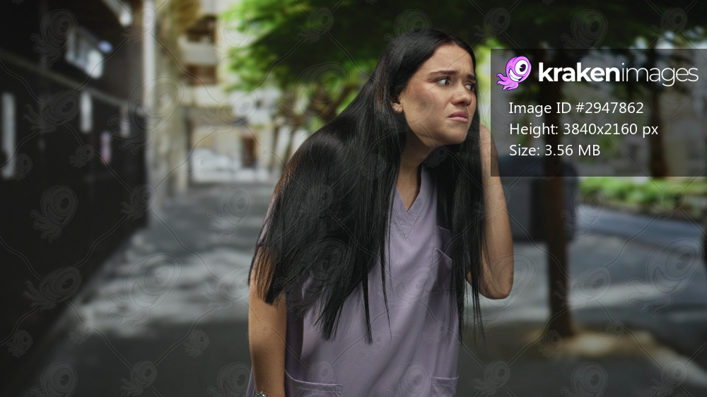 Young nurse in lavender scrubs holding hand to ear, wincing while listening on a city street with trees and a trashcan; hearing difficulty distress.