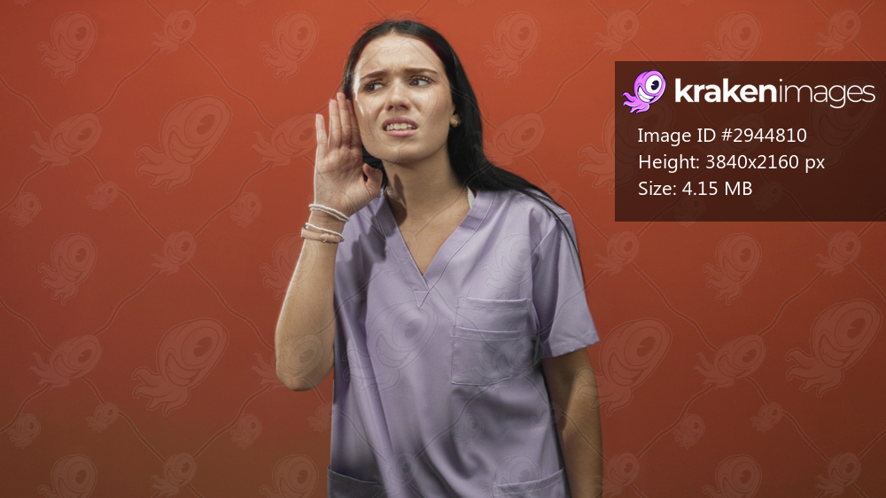 Young nurse in lilac scrubs holding hand to ear and grimacing while listening in studio; frustration communication.