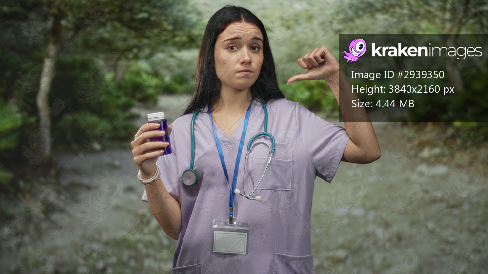 Young nurse in lilac scrubs with stethoscope holding a purple pill bottle and giving thumbs down gesture in forest; patient safety concern.