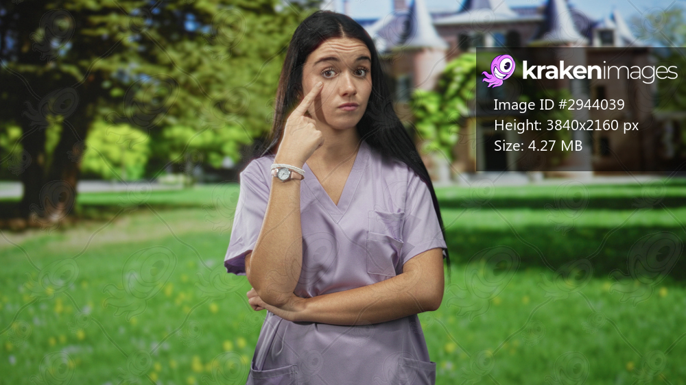 Young nurse touching her cheek with finger in front of a historic building on a grassy lawn; thoughtful doubt.