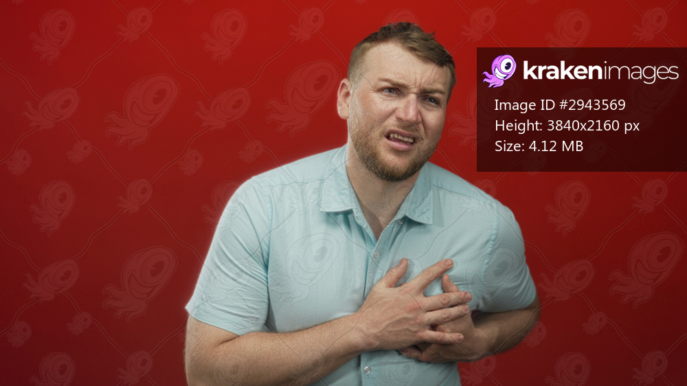 Young overweight man clutching chest with both hands while grimacing and leaning forward in red studio; medical emergency distress.