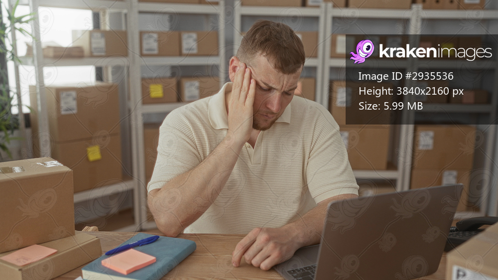 Young overweight man with hand on cheek amid stacked parcel boxes at office building desk with laptop, notebook and shipping labels; stress deadline.