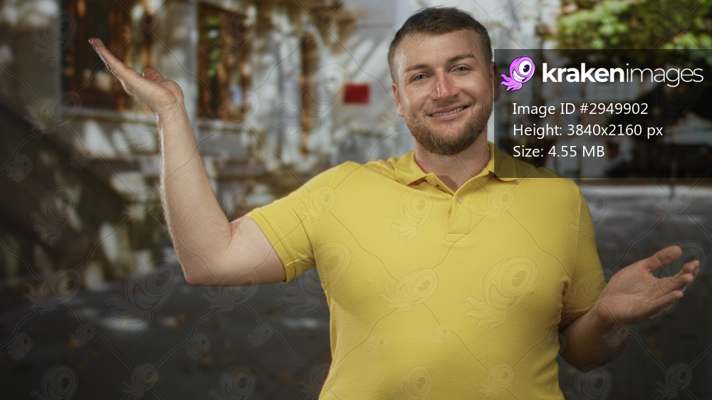 Young overweight man palms up shrug on a sunlit street in yellow polo shirt showing bare forearm and open palms; playful uncertainty.