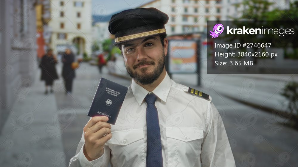 Young pilot in uniform holding a german passport outdoors on a street, showcasing a professional demeanor against an urban backdrop.