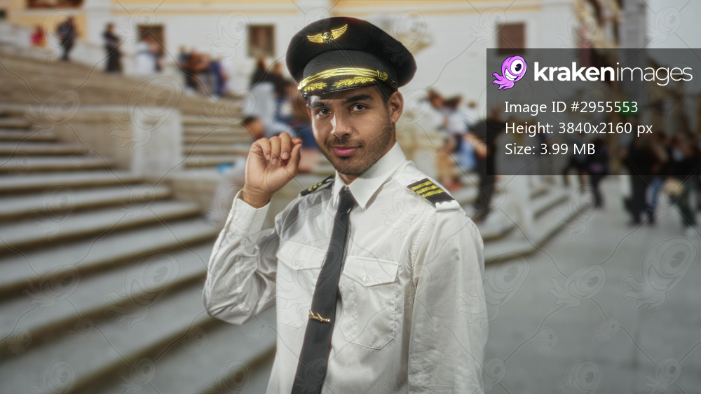 Young pilot man in uniform adjusting his tie and pointing finger by crowded stone steps of a building; pride professionalism.