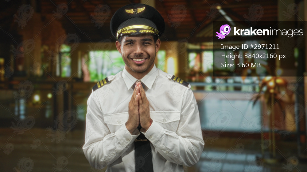 Young pilot man in uniform with hands pressed together in a greeting gesture at hotel lobby reception desk; welcome humility.