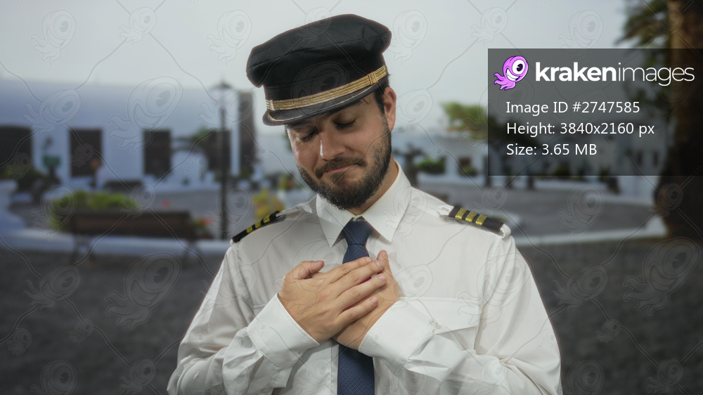 Young pilot man in uniform standing outdoors on a street with hands on chest, displaying gratitude and smiling in a casual urban setting with white buildings. - Kraken Images