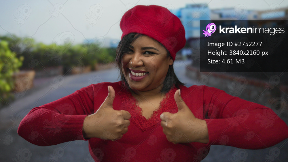 Young plus size latin woman smiling on a city street, wearing a red beret and sweater, showing thumbs up, embodies cheerful confidence in an outdoor urban setting. - Kraken Images