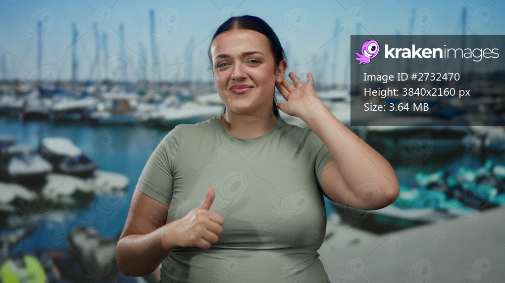 Young plus size woman smiling near a seaside port with boats in the background, enjoying the outdoor view and the serene atmosphere, showcasing a positive and confident demeanor. - Kraken Images