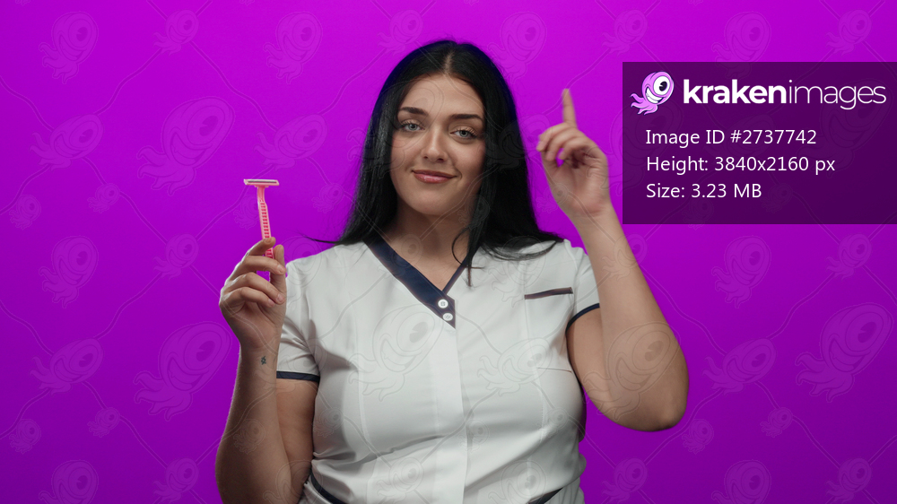 Young plus size woman smiling while holding a pink razor against a vibrant pink background, highlighting body positivity and self-care.