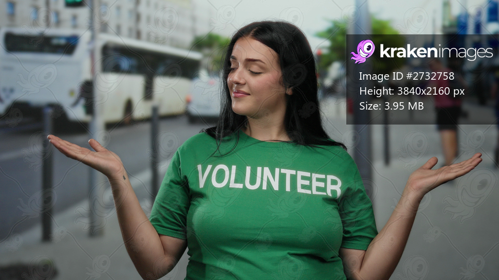 Young plus-size woman volunteer smiling on a city street, wearing a green shirt, surrounded by buses and people in an urban outdoor setting.