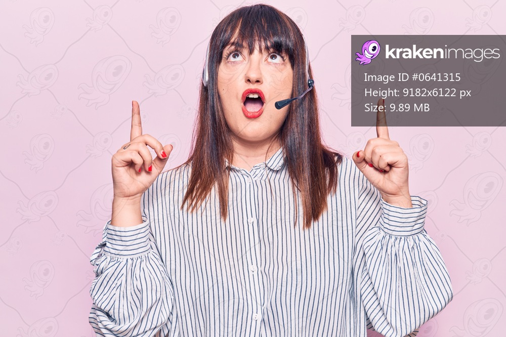 Young plus size woman wearing call center agent headset amazed and surprised looking up and pointing with fingers and raised arms.