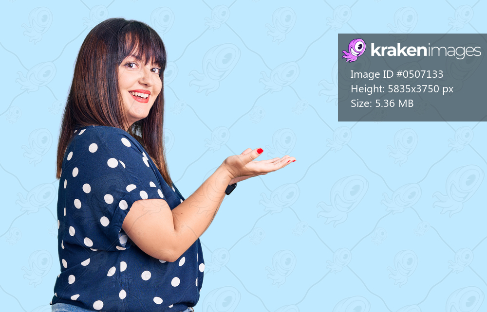 Young plus size woman wearing casual clothes pointing aside with hands open palms showing copy space, presenting advertisement smiling excited happy