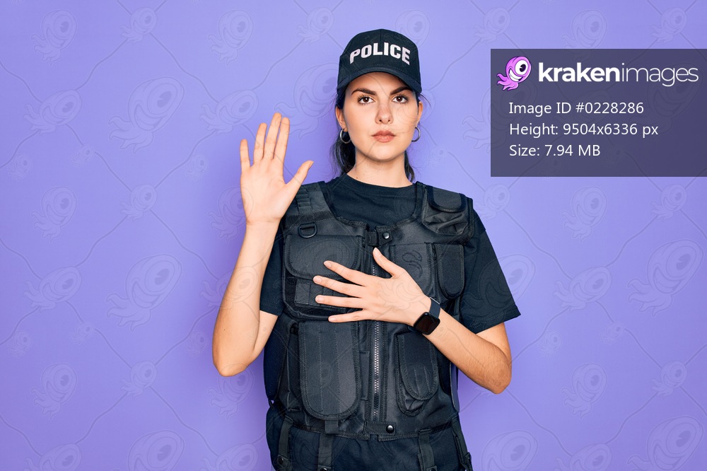 Young police woman wearing security bulletproof vest uniform over purple background Swearing with hand on chest and open palm, making a loyalty promise oath - Kraken Images