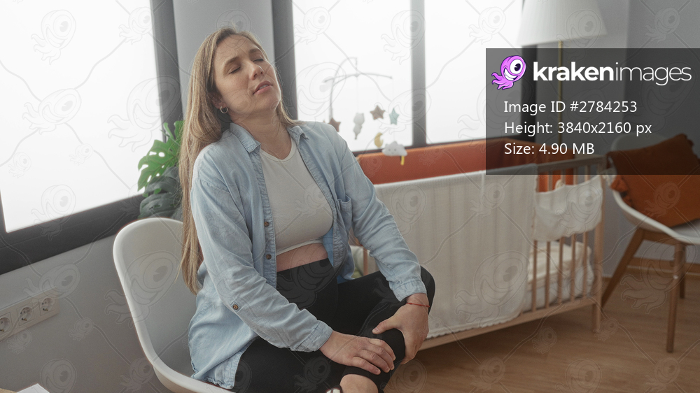 Young pregnant woman clutching knee in nursery; discomfort exhaustion maternity anticipation.