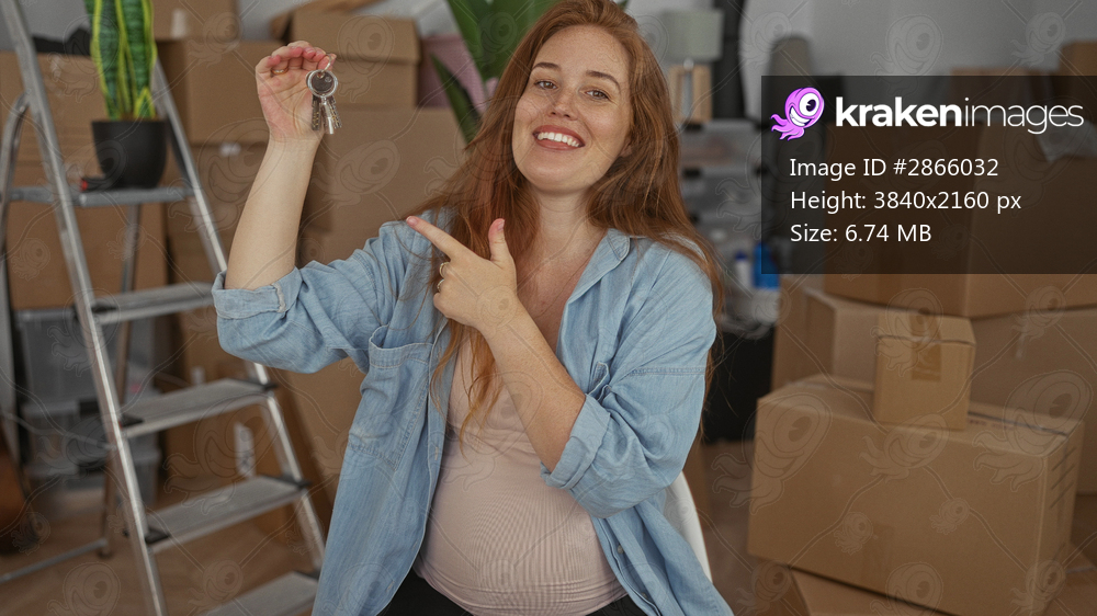 Young pregnant woman points finger to keys amid cardboard boxes in building; homecoming anticipation.