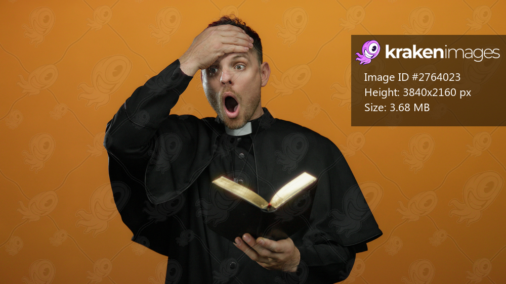 Young priest reading bible with surprise on bright orange backdrop, showcasing religious devotion and unexpected discovery.