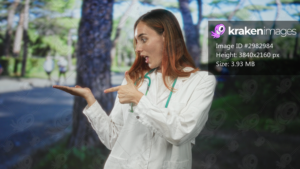 Young redhead doctor woman in white coat with green stethoscope holding palm out and giving thumbs up in forest scene; reassurance wellness.