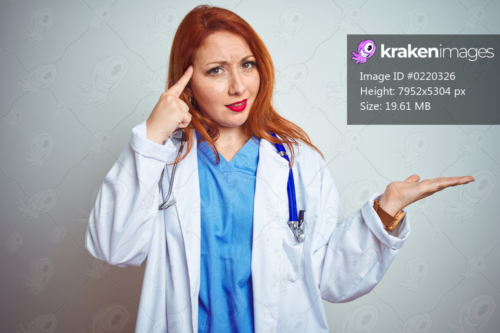 Young redhead doctor woman using stethoscope over white isolated background confused and annoyed with open palm showing copy space and pointing finger to forehead. Think about it. - Kraken Images