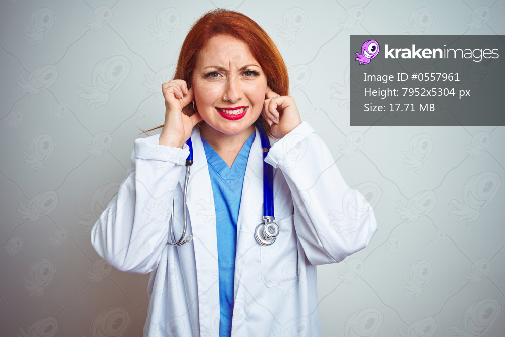 Young redhead doctor woman using stethoscope over white isolated background covering ears with fingers with annoyed expression for the noise of loud music. Deaf concept. - Kraken Images
