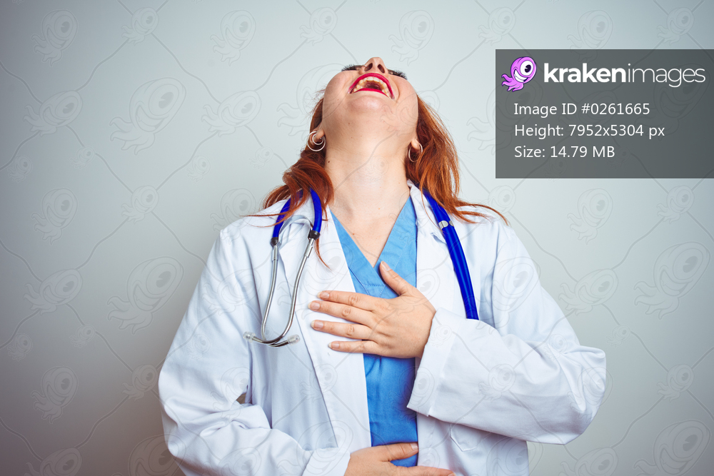 Young redhead doctor woman using stethoscope over white isolated background laughing at you, pointing finger to the camera with hand over body, shame expression - Kraken Images