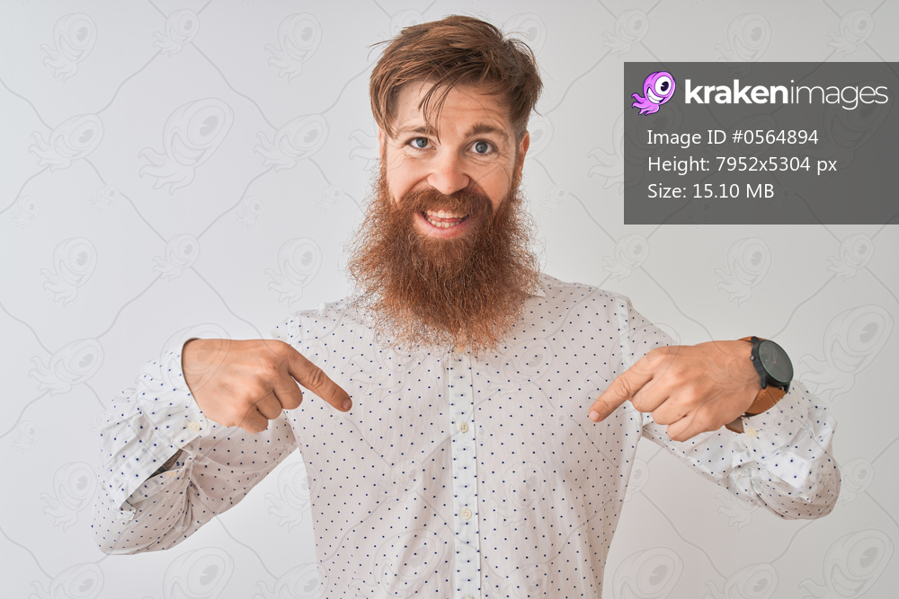 Young redhead irish man wearing shirt standing over isolated white background looking confident with smile on face, pointing oneself with fingers proud and happy. - Kraken Images