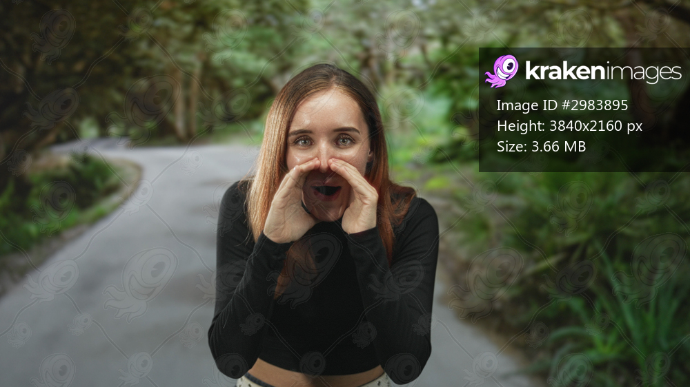 Young redhead woman cupping hands to mouth calling out on a winding forest road, leaning forward with studded belt visible, mid shout; urgent appeal.