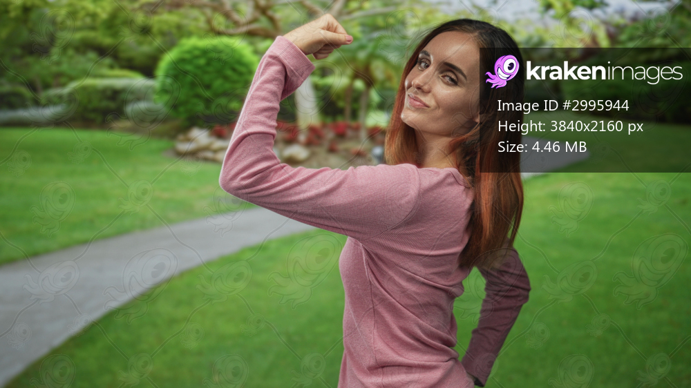 Young redhead woman flexes arm showing bicep and fist on a paved garden path in a forest park, looking over shoulder with a slight smile; confidence empowerment. - Kraken Images