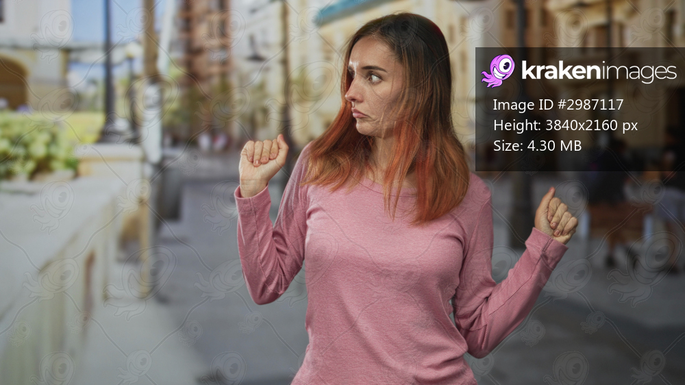 Young redhead woman with hands raised in a shrug gesture, pursed lips and visible hands on street wearing a pink sweater, lamp posts and buildings behind; confusion. - Kraken Images