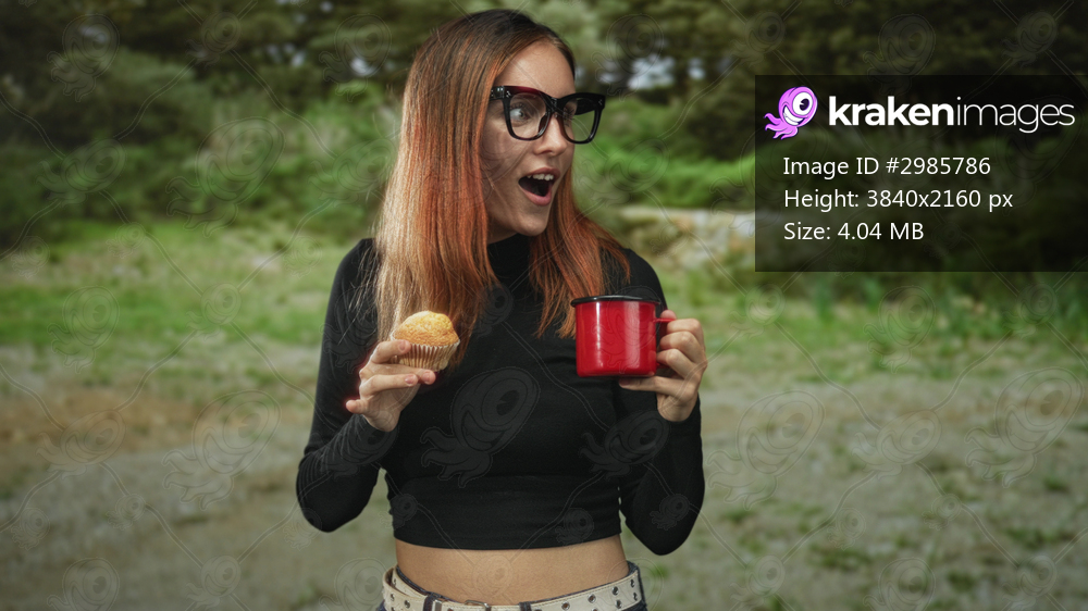 Young redhead woman holding a muffin and red enamel cup with exposed midriff, smiling and offering, set in a forest; cheerful picnic break.