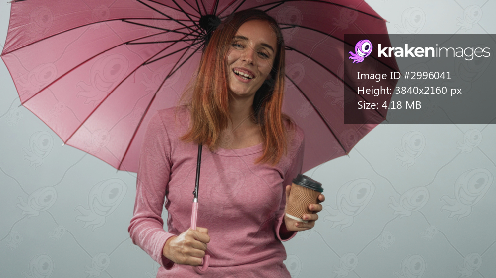 Young redhead woman holding a pink umbrella and a takeaway coffee cup, smiling with hand visible in a studio; cozy morning.