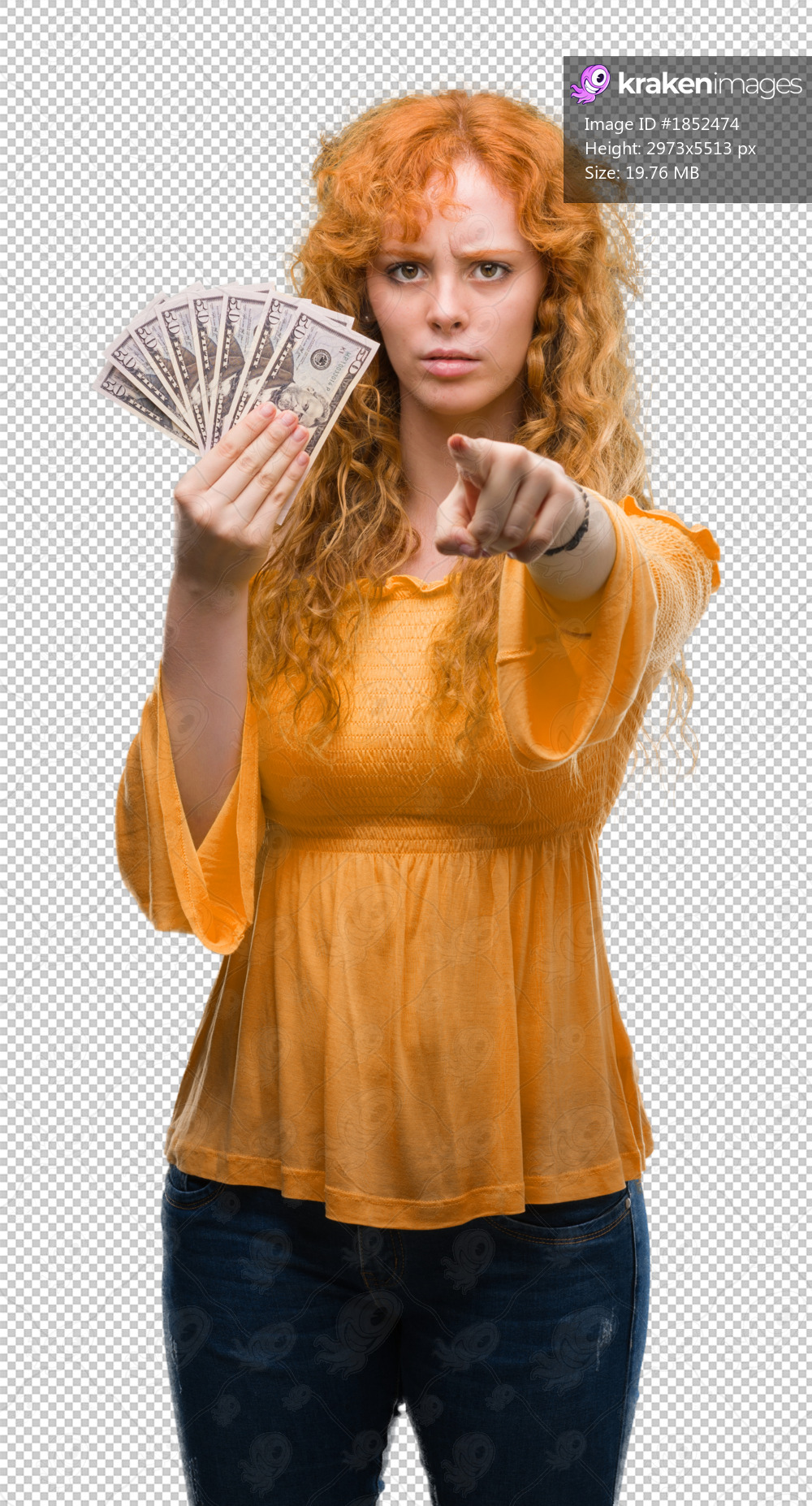 Young redhead woman holding dollars pointing with finger to the camera and to you, hand sign, positive and confident gesture from the front