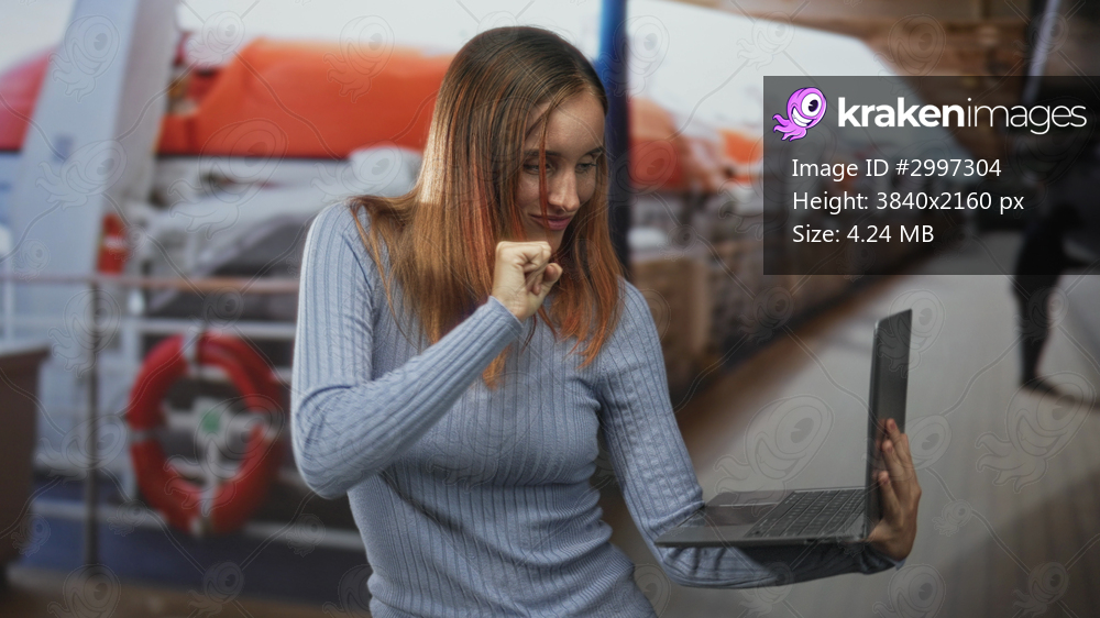 Young redhead woman holding laptop with left hand and making small celebratory fist with right hand on cruise ship deck with lifeboats and life ring; joy remote work. - Kraken Images