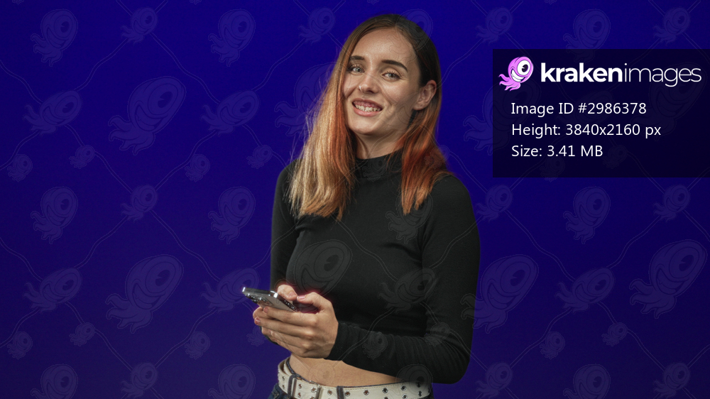 Young redhead woman holding smartphone and texting with hands, smiling in blue studio wearing black long sleeve top and white belt; friendliness.