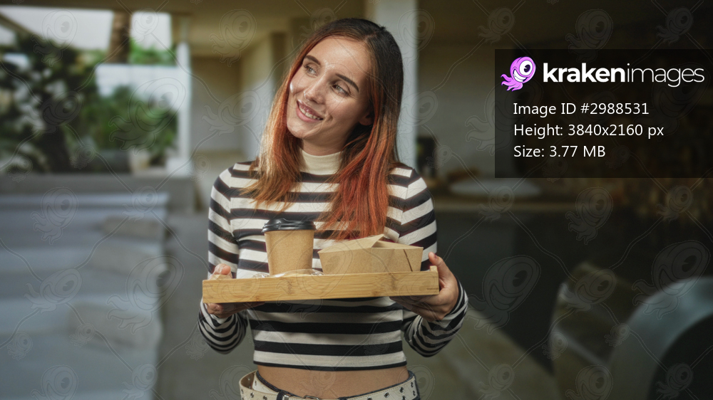 Young redhead woman holding wooden tray with coffee cup and takeaway box in building lobby; hospitality contentment.
