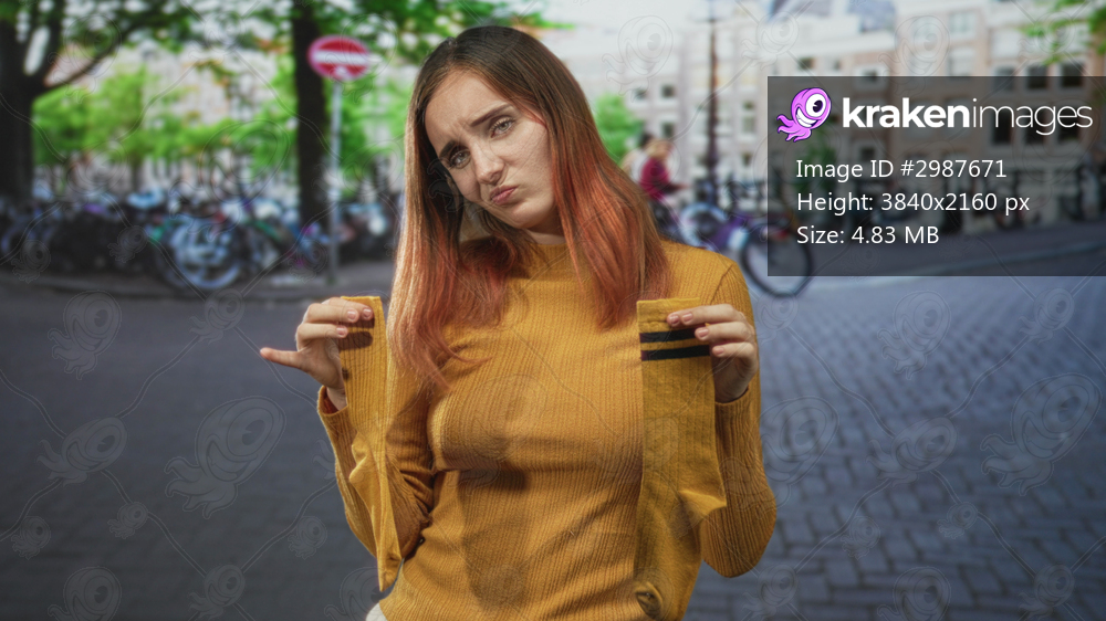 Young redhead woman holding yellow socks in hands on a street near bicycles and buildings, grimacing and shrugging with uncertain gaze; disgust doubt.