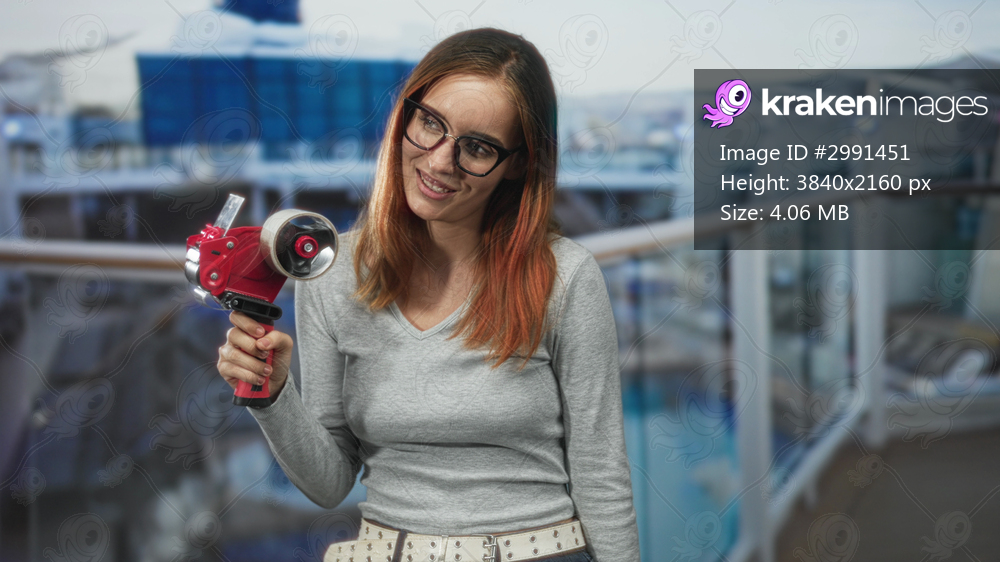 Young redhead woman holds a red tape dispenser and smiles in an airport terminal while posing near a glass railing; cheerful curiosity.