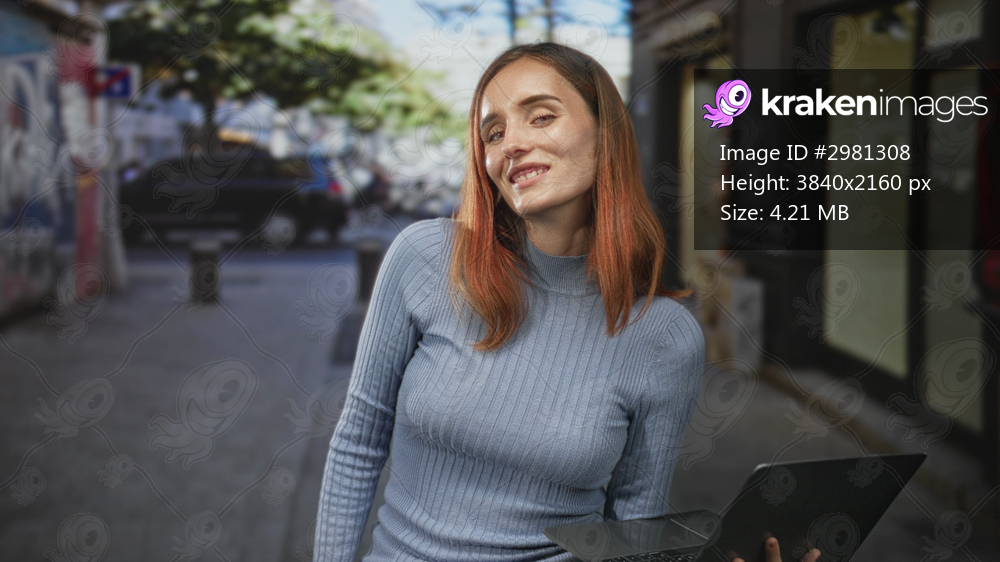 Young redhead woman holds laptop with one hand on street storefront, slight smile and tilted head; confidence productivity remote work.