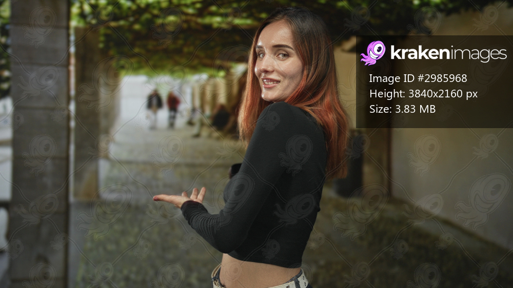 Young redhead woman in a black crop turtleneck makes an open hand gesture in a columned covered street corridor showing a cropped midriff; cheerful engagement. - Kraken Images