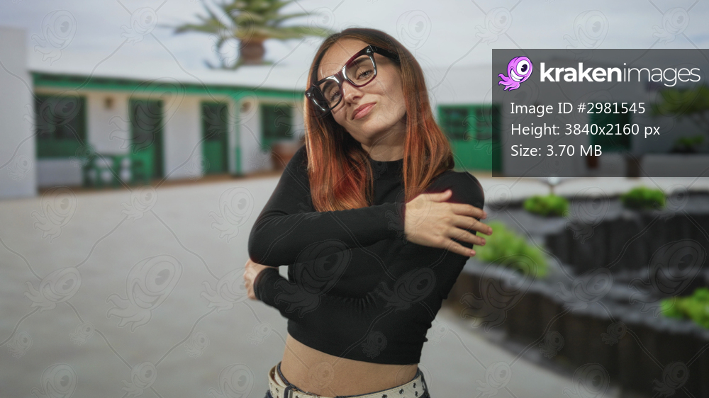 Young redhead woman in black crop top and glasses touches shoulder, bares midriff and tilts head in front of white building with green doors; casual confidence. - Kraken Images