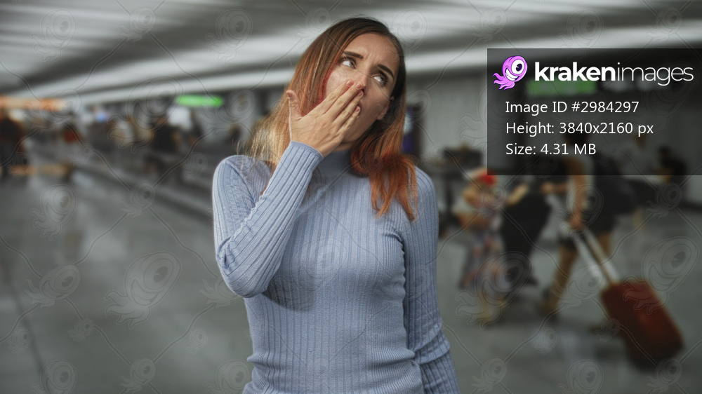 Young redhead woman in blue sweater with hand over mouth yawning in a crowded airport terminal by a moving walkway; jetlag fatigue.