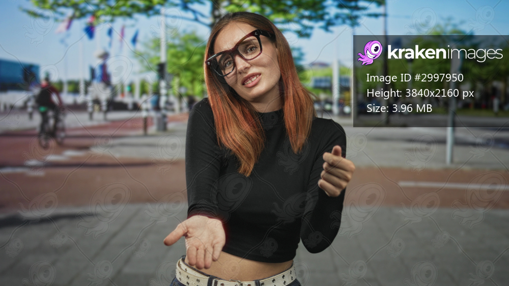 Young redhead woman in glasses touches chest with both hands and offers palm forward gesture on an urban street; apology sincerity.