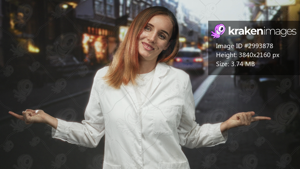 Young redhead woman in white medical coat gestures palms up, smiling and tilting head on a busy street at dusk; approachable confident.