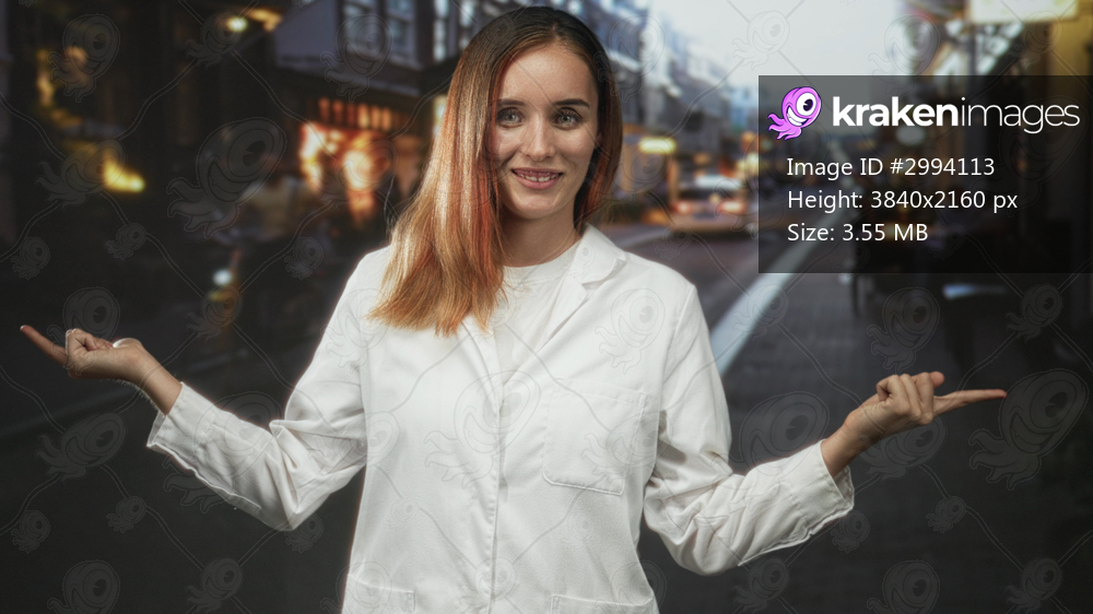 Young redhead woman in white medical coat gestures palms up, smiling and tilting head on a busy street at dusk; approachable confident.