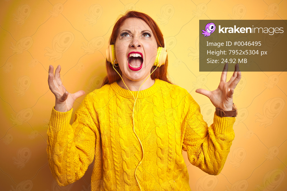 Young redhead woman listening to music using headphones over yellow isolated background crazy and mad shouting and yelling with aggressive expression and arms raised. Frustration concept. - Kraken Images